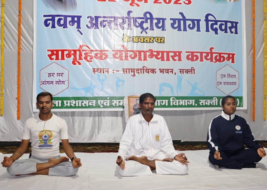 On the occasion of Ninth International Yoga Day today, district level program in the main hospitality of Chandrapur MLA Mr. Ramkumar Yadav in the presence of in-charge Collector Mr. Birendra Lakda and Superintendent of Police Mr. MR Ahire from 7 am to 8 am at Community Hall, Sakti near Jawaharlal Nehru College Held in On this occasion, various public representatives including Mr. Girdhar Jaiswal, SDM Sakti Mr. Pankaj Dahire, district administration and district officers of various departments and dignitaries, common people and small children participated in the program and performed yoga. School children also participated in the Yoga Day program in large numbers.