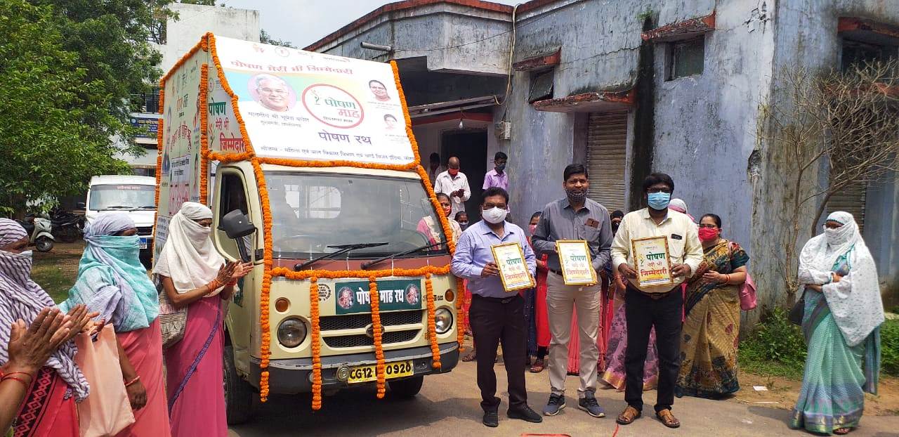 Raipur 11 September 2020. Malnutrition is becoming a major problem due to lack of awareness and knowledge about correct nutrition. National Nutrition Month 2020 is being organized for public awareness towards this. During this month, the nutrition chariots in Chhattisgarh are reaching the villages and explaining the importance of nutrition to the people. In remote remote areas like Dantewada, Balrampur, Korba including Raipur, Balod, these chariots are bringing the message of nutrition and hygiene through audio.