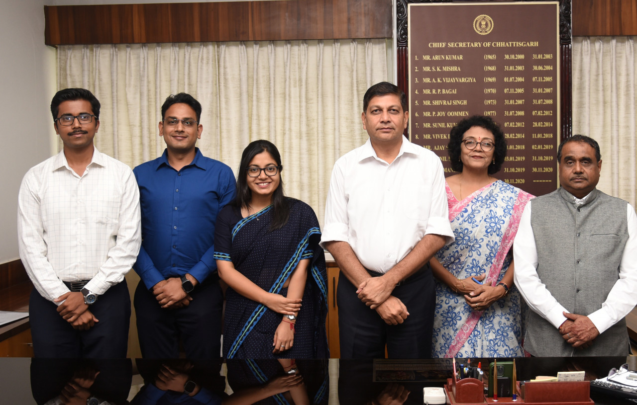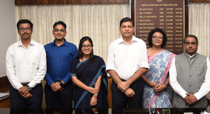 Officers allotted to the state of Chhattisgarh of the Indian Administrative Service 2022 paid a courtesy visit to the Chief Secretary Shri Amitabh Jain at Mantralaya today. Indian Administrative Service 2022 officer Ms. Namrata Choubey, Assistant Collector Balodabazar, Mr. Prakhar Chandrakar, Assistant Collector District Kanker and Assistant Collector Raigarh Mr. Yuvraj Marmat were included in the meeting. Director of Chhattisgarh Academy of Administration Mr. T.C. Mahawar was also present on the occasion.