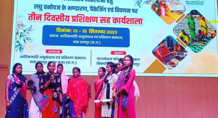 A three-day training cum workshop was organized jointly with the Government of Chhattisgarh, Tribal Research and Training Institute, Raipur and Foundation for Ecology Security from 13 to 15 September 2023. In the workshop, the Baiga women leader of the specially protected tribe of the district, while presenting, shared the experiences of improving sustainable livelihood, health and nutrition through the climate change adaptation eco-agriculture method being done in the Baiga dominated area of development block Bodla. In the context of environmental farming, information was given about seed selection, seed treatment, row mixed farming and kitchen garden. In the training cum workshop, Baiga women shared their experiences of forest produce collection, storage, processing and marketing.