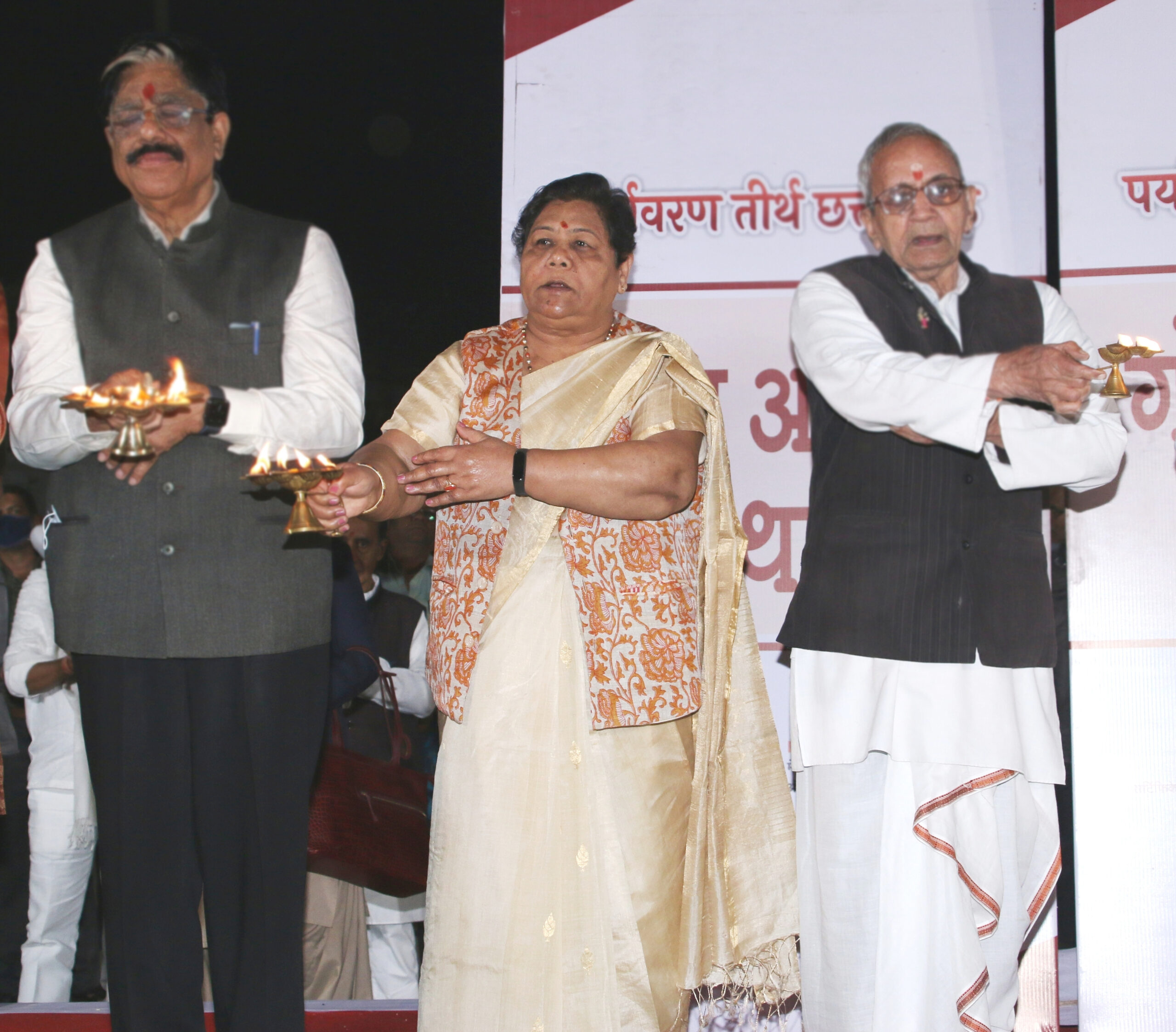 Raipur, 15 December 2021. One who lives with nature, lives in harmony with nature and one who remains positive is always healthy and healthy. This was stated by the Governor Ms. Anusuiya Uikey while addressing the program organized on the occasion of the launch of the Environment Teerth-Raipur Project today. He called upon the common people to take a resolution and said that considering nature as a mother, respect it the same way, do not exploit it indiscriminately. What we get from nature, save it and preserve it for the coming generation also. Governor inaugurated the Raipur project of environment pilgrimage at Mahadev Ghat on the banks of Kharun river in the capital Raipur and prayed for happiness and prosperity of the state by performing aarti of Kharun river.