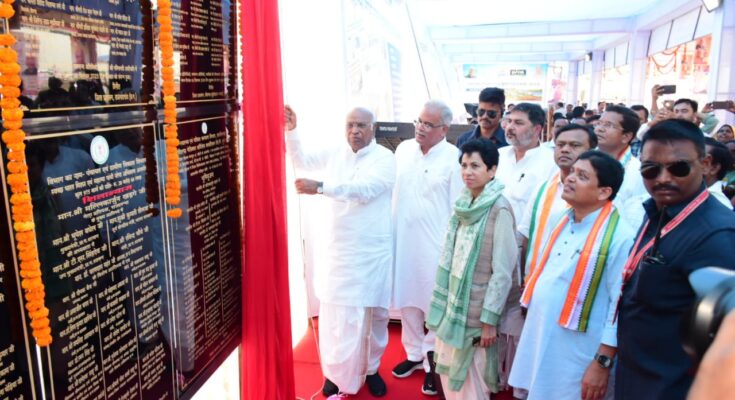 355 for Rajnandgaon, Mohla-Manpur-Ambagarh outpost and Khairagarh-Chhuikhadan-Gandai district by Leader of Opposition Rajya Sabha Shri Mallikarjun Kharge as the chief guest in the conference of trust in village Thekwa of Rajnandgaon development block and Chief Minister Shri Bhupesh Baghel presiding over the program. Performed bhumi pujan and inauguration of a total of 1 thousand 867 development works costing Rs 23 lakh crore. Which includes Bhoomi Pujan of 1 thousand 691 works worth Rs 177 crore 86 lakh and inauguration of 176 works worth Rs 177 crore 36 lakh.