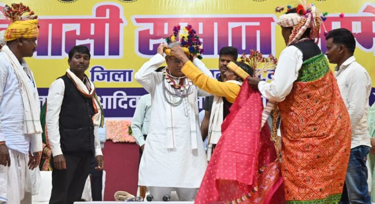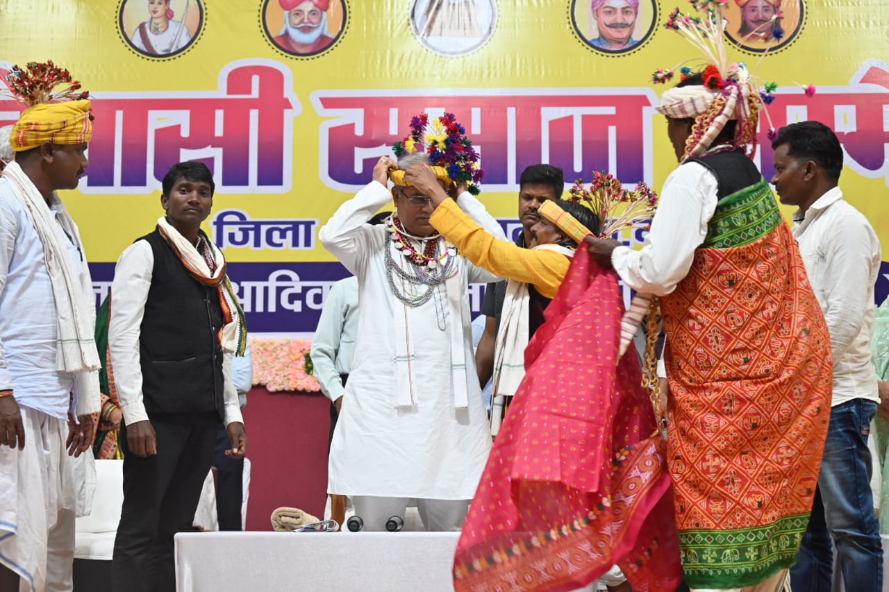 Chief Minister Shri Bhupesh Baghel was welcomed by Baiga Samaj with Baiga clothes and Gond* society with yellow gamcha and yellow rice in the convention of tribal society organized in Kawardha. On this occasion, many public representatives and a large number of tribal community people including Health Minister Shri TS Singhdev and Forest Minister Shri Mo Akbar were present.