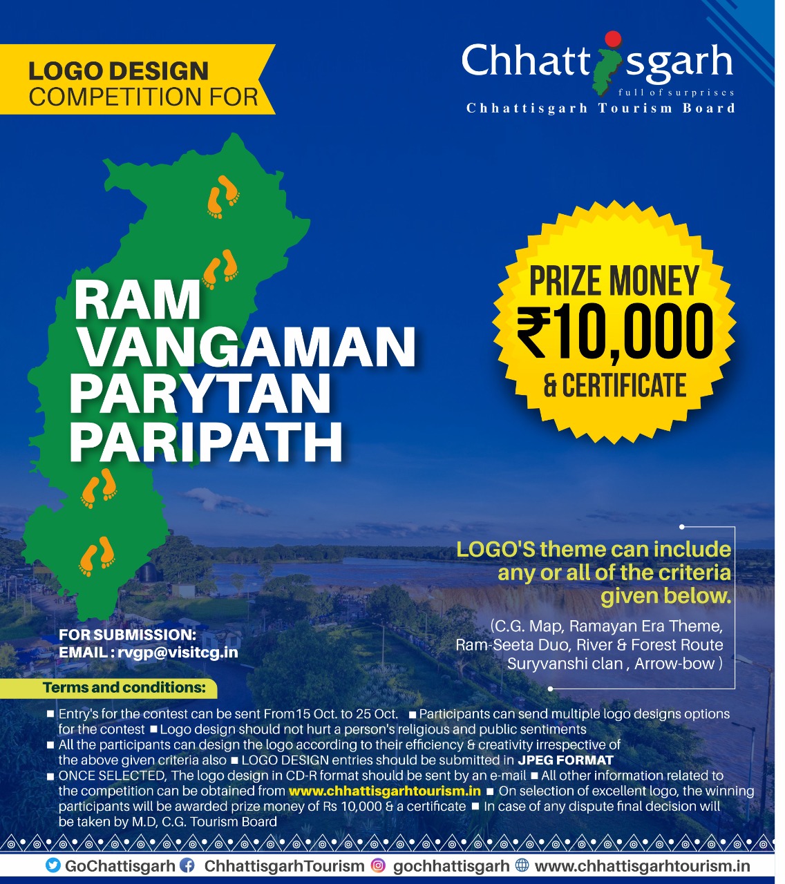 Raipur, 21 October 2020. A logo design competition has been organized by the state government’s tourism department for the Ram Vangaman tourism circuit. On the selection of excellent ‘logo’ in the competition, the winning participant will be awarded a prize and certificate of Rs 10,000. The participants can send their designed logo to the tourism department’s email ID TAHACH / APPEJBHPAD by 25 October 2020. All information related to the competition can be found in the website of Chhattisgarh Tourism Board, Prunbeeinjajpehantijawanatpe.