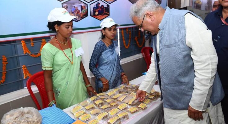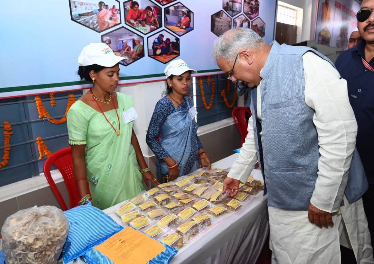 Chief Minister Mr. Bhupesh Baghel today reached village Beltukri in Masturi assembly constituency of Bilaspur district in a series of his popular meet-meet programme. He inspected the Ripa built on the lines of Gauthan and Super Bazar here. The Chief Minister observed several business activities being conducted in Ripa including Bakery Industry, Dona Pattal Industry, Bori Industry, Furniture Mart, Phenyl Manufacturing Fabrication, Spice Industry, Washing Powder Manufacturing, Bamboo Crafts.