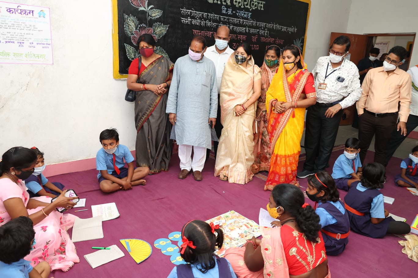 In-charge Minister Dr. Tekam observed the Bal Sabha Umang program organized in the Higher Secondary School of Kanakbira in Sarangarh block. He saw and appreciated the innovation of teaching children in sports and games under the learning program. Similarly, he observed the other activities being done in the school, in which he observed the art work, model and project work of science and mathematics prepared by the children and asked questions related to it to the children. He congratulated the children for giving the correct answer. During this, he took information about his project work from Vandana, a student of class II and Simran, a student of class III. Under adult education, he took information about his education from Shashi Sidar of the village. During the inspection, he visited the newly admitted children in the school, RTE, Under the read-write campaign, taking advantage of adult education and distributed books to the children admitted under the Mahtari Dular Yojana. He asked all the children to study diligently. During the inspection, he observed the online class operation. In addition, assistive devices were also provided to the differently-abled students. During this, Minister Dr. Tekam also planted Ashoka sapling in the school premises.