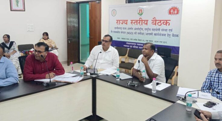 Secretary, Department of Health and Family Welfare and Medical Education, Shri Prasanna R. Today took a meeting of international and national organizations and non-governmental organizations (NGOs) working in association with the department in various health programmes. He discussed in detail the strengthening of health services and providing treatment to maximum number of people through government hospitals in the meeting held at Swasthya Bhawan in Nava Raipur. He reviewed the work being done in the health sector with the participation of cooperative organizations and gave instructions to make them more effective. Director Health Services Mr. Bhim Singh, Director National Health Mission Mr. Bhoskar Vilas Sandipan, Director Epidemic Control Dr. Subhash Mishra and State NGO Nodal Officer Dr. Kamlesh Jain also attended the meeting. WHO, UNICEF, Zapigo, IPAS, UNDP, USAD, Evidence Action,