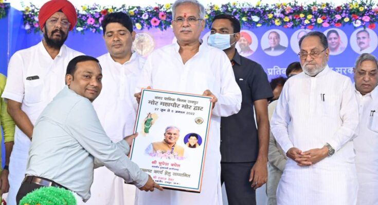 f Minister i Bhupesh Baghel attended the Peacock Mayor Mor Dwar program organized at Subhash Stadium in the city today. While addressing the program, he said that the government has equally concerned about development in rural areas as well as in urban areas. Many successful schemes have been operated to reach the services to the common citizens. The Chief Minister said that now people do not have to go to the offices for documents like income, caste, residence, marriage registration, For this we have started Mitan Yojana. Now people like these are getting 13 services sitting at home. The Chief Minister also openly praised the campaign to know the problems of common people in Raipur Municipal Corporation area and to solve them on the spot. In the program, he also honored the officers and employees of the Corporation for doing excellent work. Along with this, he also talked to the beneficiaries of government schemes in the corporation area. Mayor Mr. Ejaz Dhebar, MLA of Raipur Rural Assembly Mr. Satyanarayan Sharma, Chairman of Chhattisgarh Home Construction Board Mr. Kuldeep Juneja, Chairman of Khadi Village Industries Board Mr. Rajesh Tiwari, Chairman of Chhattisgarh Yoga Commission Mr. Gyanendra Sharma, Chairman of Municipal Corporation Mr. Collector Sarveshwar Bhure, Municipal Corporation Commissioner Shri Mayank Chaturvedi and other officials including Pramod Dubey and a large number of residents also participated.– – ————————— – – – — – —Addressing the residents of the city, the Chief Minister said that a few years ago water was supplied through tankers in the Municipal Corporation area. Our government has rectified this condition of the state capital and made the capital tanker free. He also said that whether it is the matter of drinking water or cleanliness or the employment and convenience of the residents of the city, the government is making rapid efforts with the municipal corporation for all. A new water treatment plant has just been started in Birgaon Municipal Corporation area at a cost of Rs.104 crore. Expressing happiness over the National Awards received by the Government of India in the field of cleanliness to the municipal bodies of the entire state including Raipur Municipal Corporation, the Chief Minister said that the hard work of the councilors, officers, Chhattisgarh has been awarded with more than 60 awards due to the sweat and public support of cleanliness didis. It is a matter of pride for every Chhattisgarhi person. He also appealed to make efforts to bring Raipur Municipal Corporation from the sixth number to the first number in the cleanliness survey this time. The Chief Minister also told about the state government’s Dhanwantri Yojana, Dr. Khubchand Baghel Swasthya Sahayata Yojna up to Rs.5 lakh for the treatment of the poor and Chief Minister’s Special Health Assistance Scheme with assistance of up to Rs.20 lakh for serious diseases.