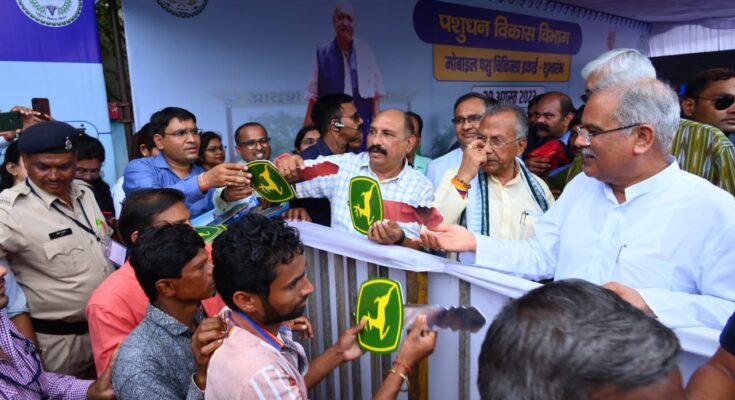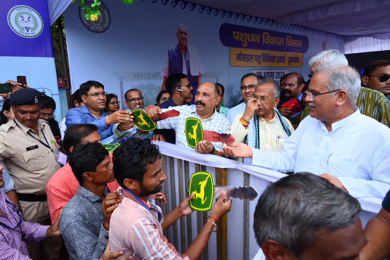 Chief Minister Mr. Bhupesh Baghel reached the material distribution program of Rajiv Gandhi Kisan Nyay Yojana and other schemes at District Headquarters Swami Atmanand Hindi Medium School Mahasamund ground today. During this, the Chief Minister handed over the key of tractor to 10 beneficiaries of the Submission Component 3 Scheme on Agricultural Mechanization and harvester to one beneficiary of the Submission Component 4 Scheme on Agricultural Mechanization. During this, the Chief Minister discussed with the beneficiaries and inquired about their well-being.