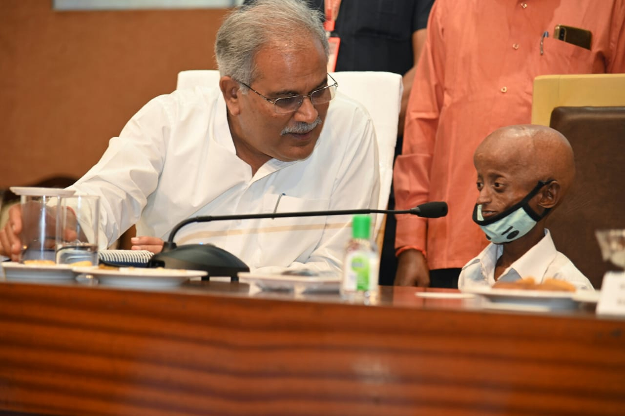 Raipur, 22 October 2021. On getting information from the media about the life-struggle of tribal teenager Shailendra of Gariaband, who was suffering from incurable Progeria disease, Chief Minister Bhupesh Baghel called him to Raipur today and met him during the IG-SP conference. He also invited Mr. Shailendra and his father for a meal with him. Shailendra was also given a place in the ‘Guard of Honor’ given to the Chief Minister by the police force after the SP conference.