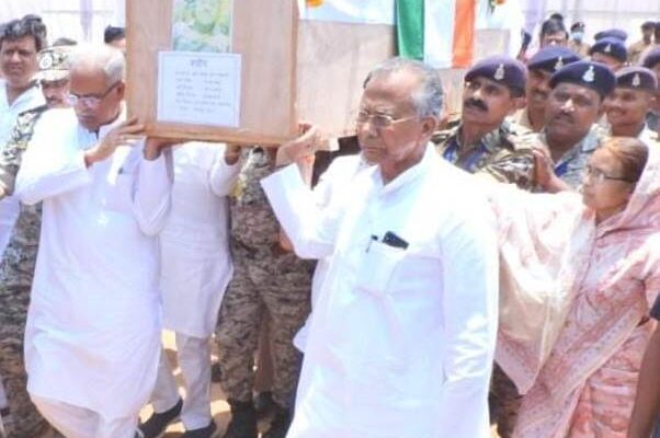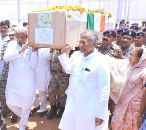During this, Home Minister Mr. Tamradhwaj Sahu, Lok Sabha MP Mr. Deepak Baij, Rajya Sabha MP Mrs. Phoolodevi Netam, Bijapur MLA Mr. Vikram Madanvi, Dantewada MLA Mrs. Devati Karma, District Panchayat President Tulika Karma, DGP Mr. Ashok Juneja, ADG Naxal Mr. Vivekanand Sinha, Bastar Commissioner Mr. Shyam Dhavde, IG Bastar Mr. Sundarraj P., Collector Mr. Vineet Nandanwar, Superintendent of Police Mr. Siddharth Tiwari and other public representatives also paid tribute to the martyrs and shouldered the mortal remains. The mortal remains of the martyred jawans were sent to their home village by the District Administration, Dantewada.