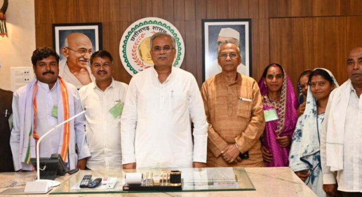 The members of Nacha Utsav Samiti Durg Rural, under the leadership of Home Minister Tamradhwaj Sahu, met Chief Minister Mr. Bhupesh Baghel in the office room of the Vidhansabha here today. He invited the Chief Minister to participate in the three-day late Dau Ramchand Deshmukh state level Nacha Gammat Mahotsav to be organized at village Nikum. The Chief Minister thanked the committee members for the invitation. State Convenor of Nacha Utsav Committee Mr. Nandkumar Sahu said that the purpose of this state level event is to preserve and promote dance art, in which about 357 dance troupes from across the state will participate. Mr. Ghasia Ram Deshmukh, Dr. Pileshwar Kumar Sahu, Mr. Mukti Sudha Diwakar and Mr. Manish Belchandan were also present on the occasion.