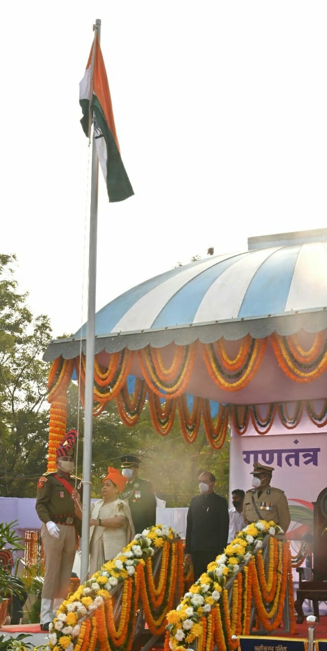 Raipur, 26 January 2021. The Governor of Chhattisgarh, Ms. Anusuiya Uike hoisted the flag at the main function organized on the occasion of 72nd Republic Day at Police Parade Ground, Raipur, capital of Chhattisgarh today. On this occasion, the National Flag and the Governor were given the Guard of Honor.