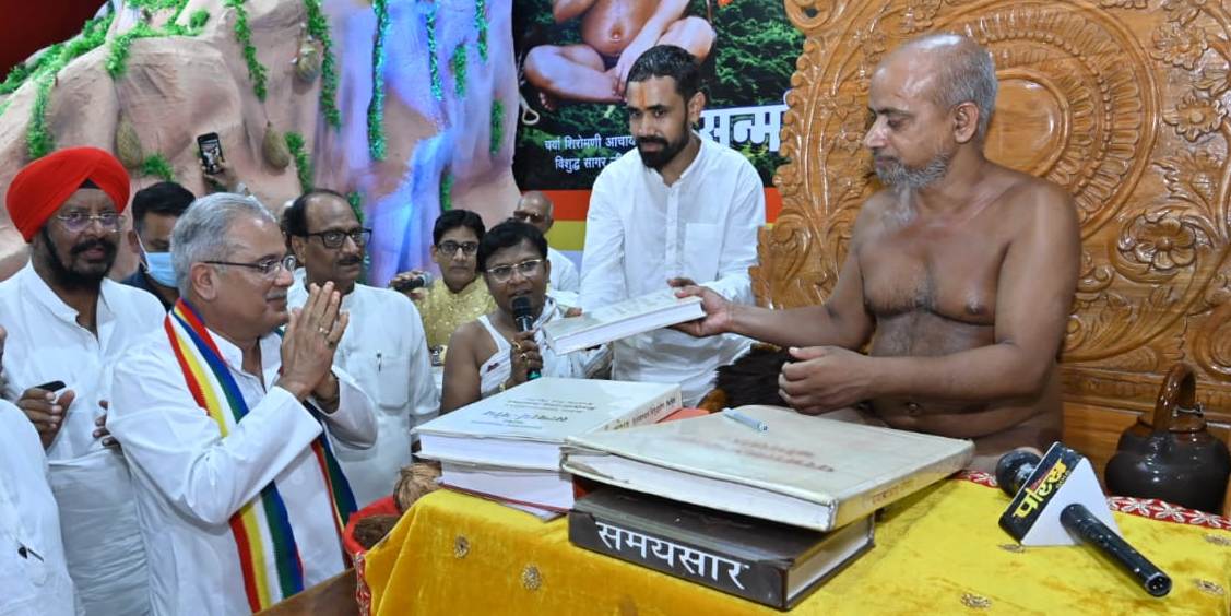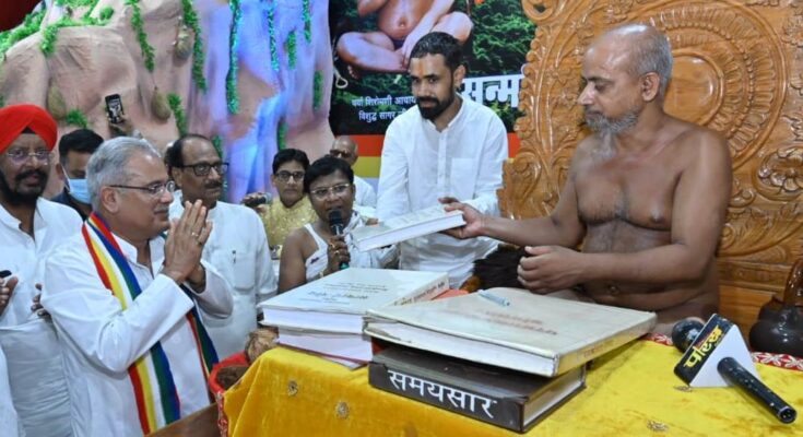 The Chief Minister was addressing the Vishuddha Varsha Yoga program organized at Vishuddha Sabha Griha at Fafadih, Sanmati Nagar, Raipur today. On this occasion, the Chief Minister released the book ‘Satyarth Bodh’ composed by Acharya Vishuddha Sagar Ji Maharaj and printed on copper leaf. This program was organized by Sakal Digambar Jain Samaj on arrival in Raipur for Chaturmas of 21 saints including Shiromani Acharya Shri Vishuddha Sagar Ji Maharaj. The Chief Minister received the blessings of happiness, prosperity and prosperity of the state from Shiromani Acharya Shri Vishuddha Sagar Ji Maharaj. The Chief Minister presented a book to Acharya Shri Vishuddha Sagar Ji Maharaj on the four symbols of Chhattisgarh namely Narva, Garuva, Ghuruwa, Bari concept, planning and functioning. This book focuses on holistic rural development.