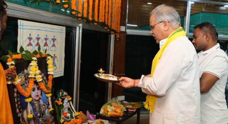 Raipur, 30 August 2021. The festival of Shri Krishna Janmashtami was celebrated with gaiety at the Chief Minister’s residence today. Chief Minister Shri Bhupesh Baghel prayed for the happiness, prosperity and happiness of the people of the state by offering prayers to Lord Shri Krishna ji with rituals amidst chanting of mantras.