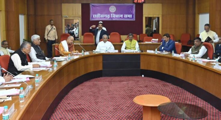 Members of the committee including Chief Minister Mr. Bhupesh Baghel, Leader of Opposition Mr. Narayan Chandel, Parliamentary Affairs Minister Mr. Ravindra Choubey are present in the meeting.