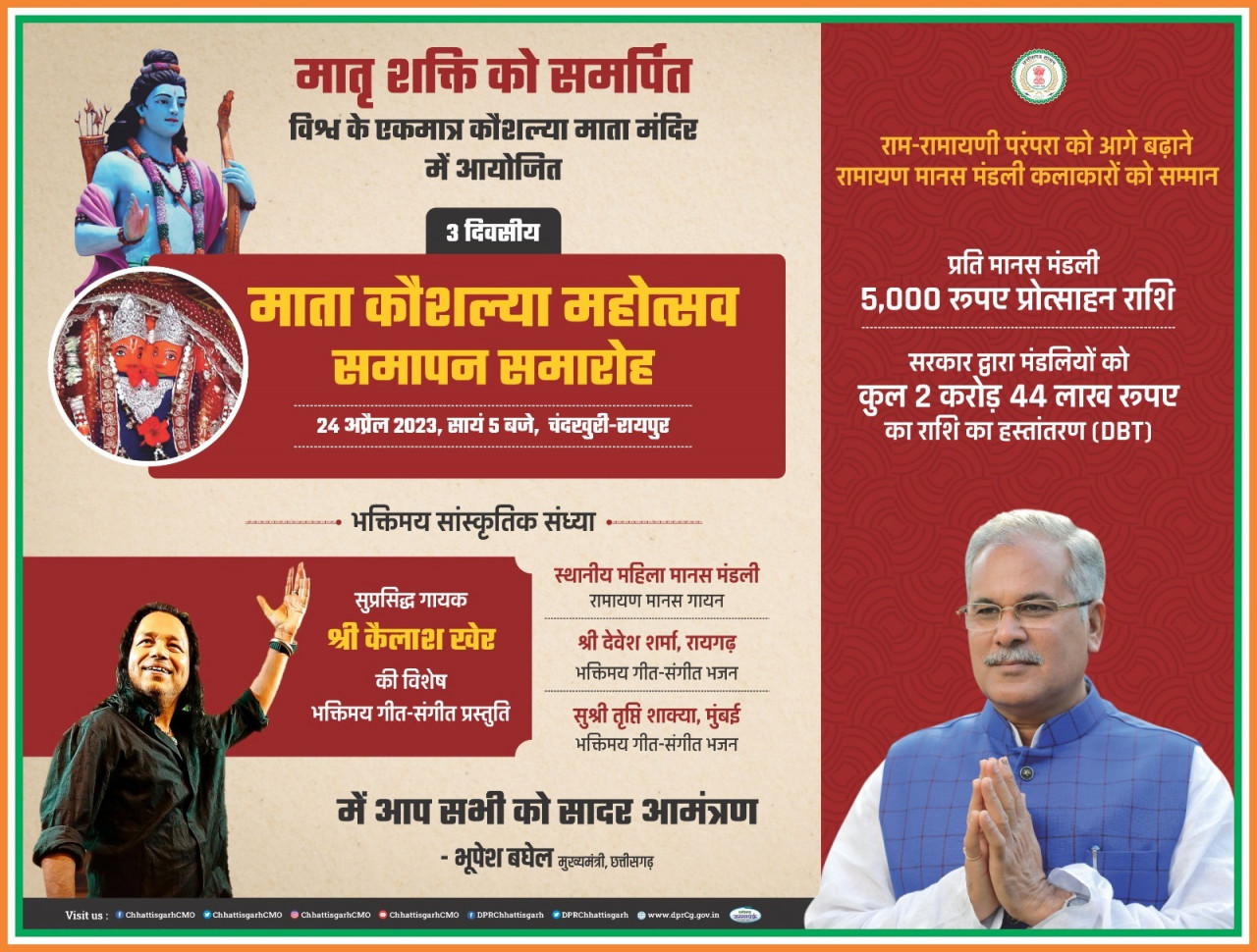 The world’s only Kaushalya Mata Temple dedicated to mother power is located in Chandkhuri, Chhattisgarh. To promote women empowerment, a three-day Mata Kaushalya Mahotsav is being organized in the temple premises. Today, the third day of the festival will end in the special hospitality of Chief Minister Mr. Bhupesh Baghel. During this, country’s famous singer Padma Shri Kailash Kher will present his devotional songs in front of the audience at Mata Kaushalya Dham.