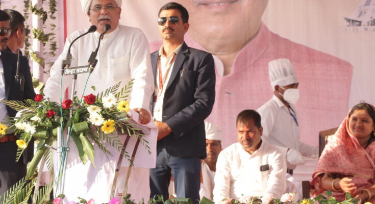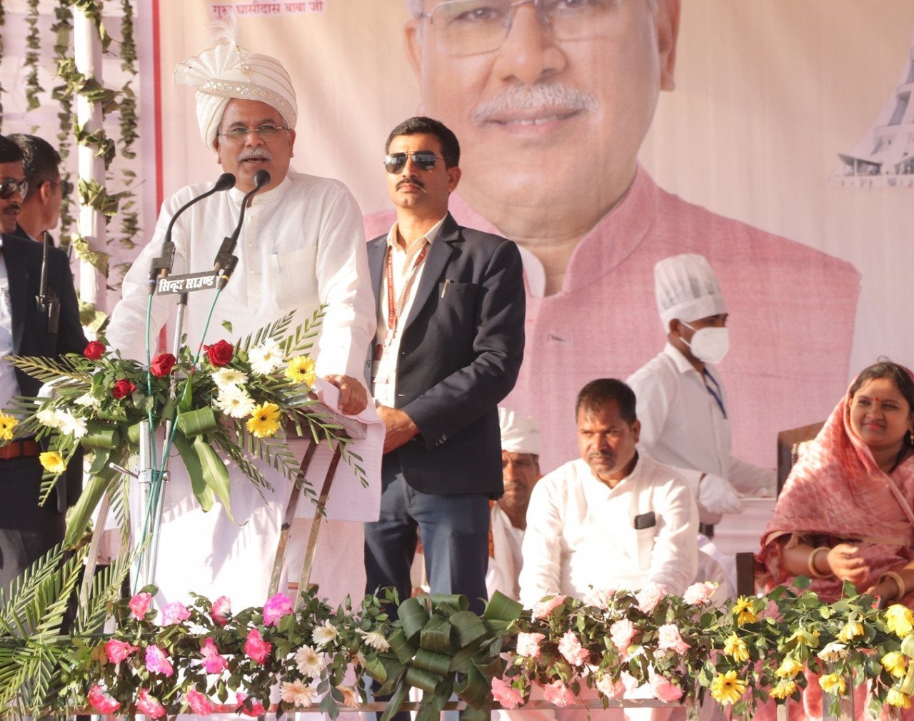 Chief Minister Mr. Baghel was addressing a huge gathering today on the occasion of the conclusion of the state level Guru Ghasidas Baba Lok Mahotsav and Jayanti Samaroh 2022 organized at Nawagarh, development block headquarters under Bemetara district. Parliamentary Secretary and MLA Nawagarh Gurudayal Singh Banjare honored the Chief Minister on behalf of the society by wearing a turban and presenting him with a symbol. On this occasion, the Chief Minister offered prayers to Baba Guru Ghasidas and wished for the happiness, prosperity and welfare of the state. On this occasion, Chief Minister Mr. Bhupesh Baghel directed the collector to hand over government land in the name of Guru Balak Das Seva Samiti on the request of Satnam Samaj under legal process. Along with this, announced to give one crore rupees for the construction of Jaitkham and building in Nawagarh.
