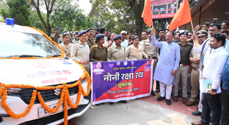 Chief Minister Shri Vishnudev Sai flagged off the Noni Raksha Rath from his residence village Bagiya here today. This Rath is being operated by the Jashpur Police Administration with the aim of creating a safe society for women so that crimes related to women and girls in the district are curbed and such cases are reduced. Along with this, prompt action should be taken on the crimes committed.