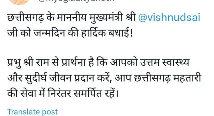 Uttar Pradesh Chief Minister Shri Yogi Adityanath has congratulated Chief Minister Shri Vishnu Dev Sai on his birthday on social media platform X. In his greeting message, Shri Yogi Adityanath wrote that he prays to Lord Shri Ram to grant you good health and long life. May you remain continuously dedicated to the service of Chhattisgarh Mahatari. Chief Minister Shri Sai has expressed his heartfelt gratitude to Shri Adityanath for the greeting message on his birthday.