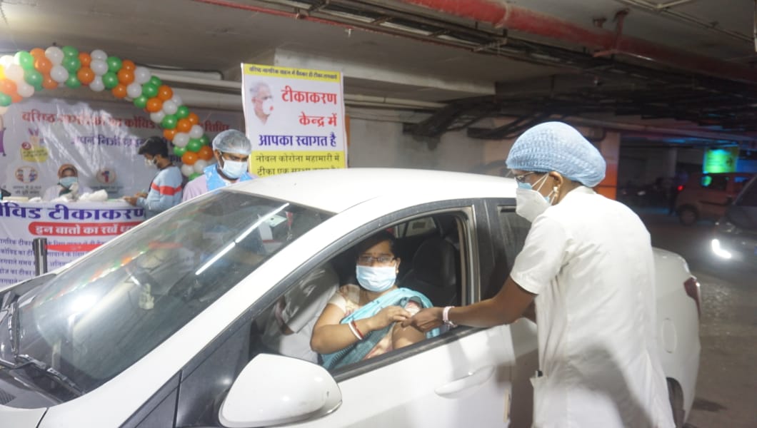 This facility has brought much relief to the senior citizens. This campaign is becoming very useful for the elderly due to rest with social distancing. Today, the elderly above the age of 80 came for vaccination. There were many of them who had problems walking. He said that for this reason, the decision to vaccinate had been withheld till now. His family also said that the worry of vaccinations of the elders of the house was removed today from this comfortable facility. For this, the parking of Surya Shopping Mall in Bhilai has been chosen. It is a place full of shady peace. On the first day of the facility, MLA Shri Devendra Yadav and Collector Sarveshwar Narendra Bhure were also present. The MLA and Collector also took feedback from senior citizens. Senior citizens said that this facility was very good, This innovation of the administration was very good as the heat was very high, so it was difficult to stay late at the vaccination center. With this, our big concern was overcome by having this facility available while sitting in the car. We were also very worried about social distancing, but because the vehicle itself got vaccinated in a very short time, our concern has completely gone away. Municipal Corporation Commissioner Shri Rituraj Raghuvanshi was also present on the occasion. The program at Surya Shopping Mall is being done by the Bhilai Municipal Corporation under the guidance of the district administration. Yesterday evening, it was reported to all WhatsApp groups of senior citizens, apart from this through the press, Senior citizens were informed in this regard through electronic media and social media. Since this morning, a large number of senior citizens reached Surya Mall and are taking advantage of vaccination. This campaign seems to be very successful on the very first day and more than 60 senior citizens have got vaccinated within 3 hours of the commencement of the session.