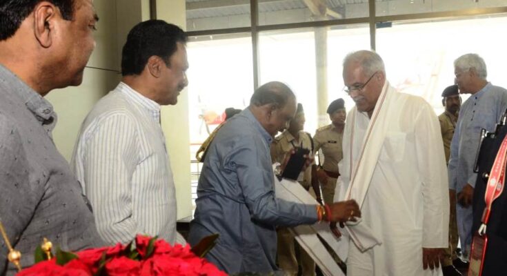 Chief Minister Mr. Bhupesh Baghel reached Maa Danteshwari Airport in Jagdalpur by regular flight for his stay in Bastar. Deputy Chief Minister Shri TS Singhdev also reached along with the Chief Minister. The guests were cordially welcomed by Industries Minister and in-charge of the district Mr. Kawasi Lakhma, President of Bastar Area Tribal Development Authority Mr. Lakheshwar Baghel, Vice President Mr. Vikram Madavi. The Chief Minister will participate in the World Tribal Day program organized on August 9 along with various programs in Jagdalpur today.