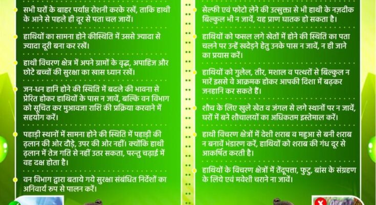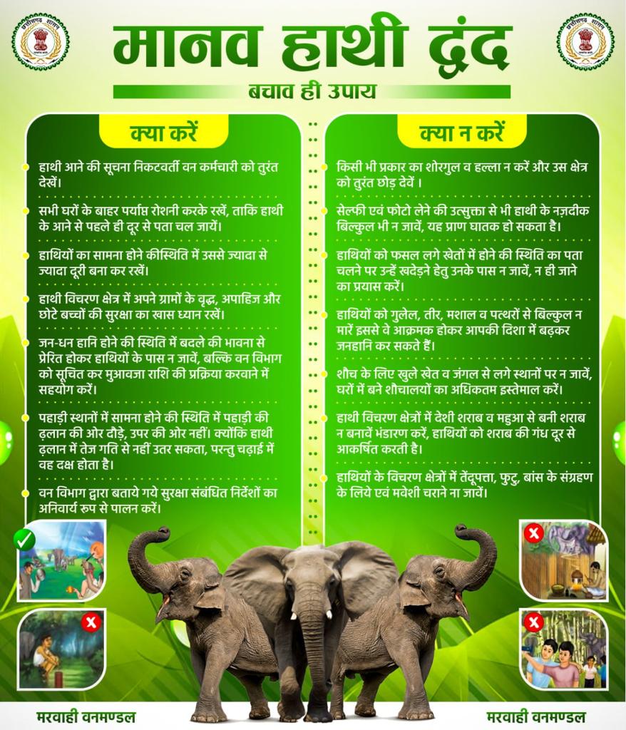 During a public awareness campaign to stop human-elephant conflict, villagers were told that information about the arrival of an elephant should be immediately given to the nearest forest employee. Keep adequate lighting in all houses, maintain distance from elephants if you encounter them. When encountered in hilly areas, run towards the slopes. Elephants cannot descend slopes at high speed, but are adept at climbing. Safety related instructions should be compulsorily followed. Do not make any kind of noise or commotion, do not take selfies and photos, do not go near the elephants to chase them away, do not hit the elephants with slingshots, arrows, torches and stones. Use home-made toilets. Do not make or store liquor from country liquor and Mahua. Do not go to the elephant roaming areas for collecting tendu leaves, futu, bamboo or for grazing cattle.