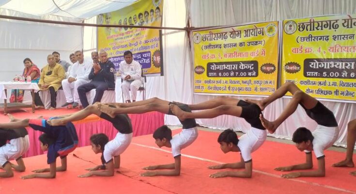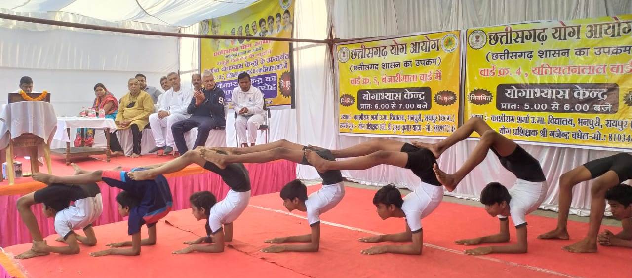 Raipur10 October2021.Raipur yoga Commission by conducting regular free yoga program for under today Sunday to Raipur Rural MLA Shri Satyanarayana Sharma said Raipur Municipal Corporation of   Ward No. -04 ( Ytiytn Red Ward ) and Ward No. -05 ( Bnjarimata ward ) of residents of for Kashiram government to highest secondary School Bnpuri   in regular yoga center ‘s launch made. Program to start in the school ‘s children ‘s yoga of performance are at the reception did.