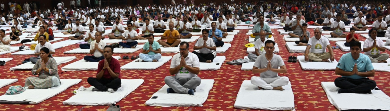 On the occasion of 9th International Yoga Day, Bilaspur district level yoga practice program was organized at Bahtarai Indoor Stadium in an atmosphere of enthusiasm and happiness. Centered on One World One Health theme and Har Ghar Aangan Yoga message, this program took place under the chief hospitality of Parliamentary Secretary Smt. Rashmi Ashish Singh. During this, District Panchayat President Mr. Arun Singh Chauhan, District Panchayat member Mr. Ankit Gaurha, President of District Cooperative Central Bank Mr. Pramod Nayak, Divisional Commissioner Mr. Bhim Singh, Collector Mr. Saurabh Kumar, Mr. Vijay Kesharwani also practiced yoga. Thousands of children and citizens performed Yoga and Pranayama. On this occasion, under the guidance of more than seven Yoga Instructors, Yogacharyas including Brahmakumari Didi Manju, the participants practiced yoga exercises, Tadasana, Vakrasana, Pranayama like Anulom Vilom, Kapalbhati, Bhujangasan, Bhramari and meditation.