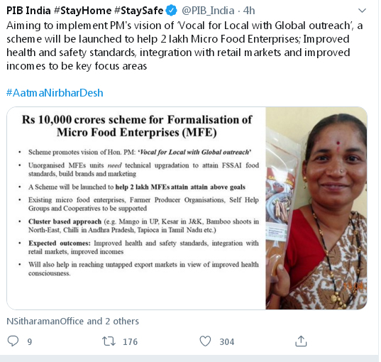 New Delhi15 May 2020: Finance Minister Nirmala Sitharaman on Friday (May 15) announced that a scheme will be launched to help 2 lakh Micro Food Enterprises aiming to implement Prime Minister Narendra Modi’s vision of ‘Vocal for Local with Global outreach’.