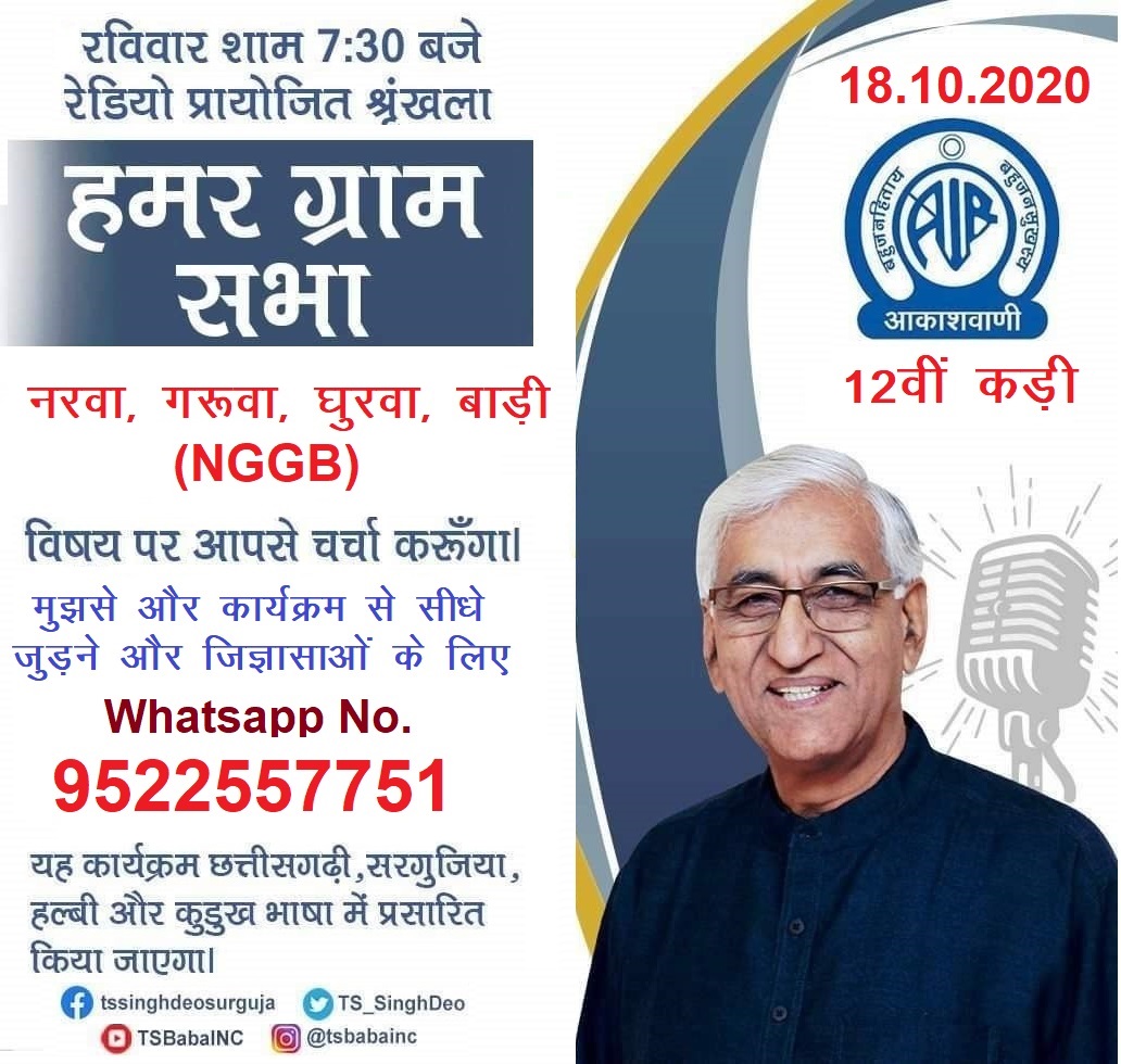 Panchayat and Rural Development Minister gave information about Narva, Garwa, Ghurwa, Bari scheme on radio Raipur. 18 October 2020. Panchayat and Rural Development Minister Shri T.S. Singhdev gave information on the ambitious …