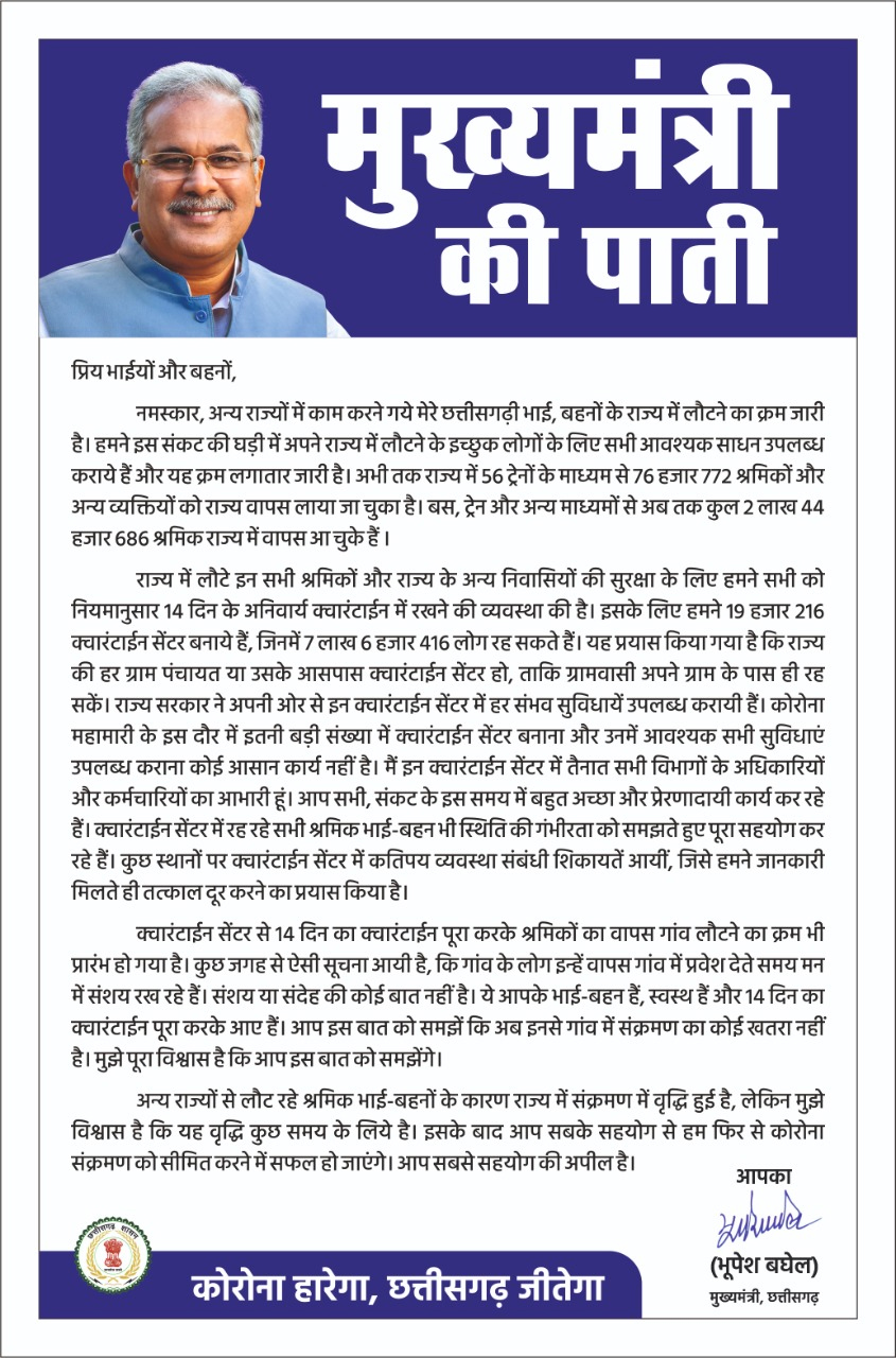 Raipur: Those who complete the quarantine period are not at risk of infection: Chief Minister Mr. Bhupesh Baghel