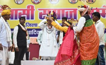 Raipur 10 October 2022    Chief Minister Shri Bhupesh Baghel was welcomed by Baiga Samaj with Baiga clothes and Gond* society with yellow gamcha and yellow rice in the convention …