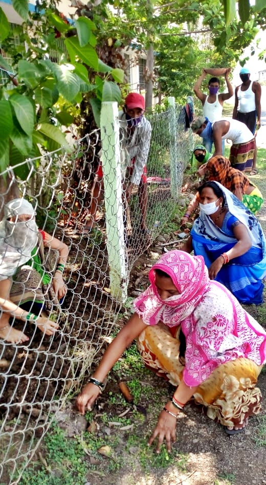 Raipur 03 June 2020 Migrant workers staying at the Quarantine Center for protection from Corona are doing gardening, sanitation work with social distancing. This makes the building complex green and …