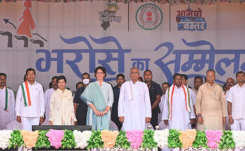 Raipur, April 13, 2023 Conference of Trust, Jagdalpur Stage program started with state anthem The Chief Minister welcomed Smt. Priyanka Gandhi by wearing Gaur Mukut.