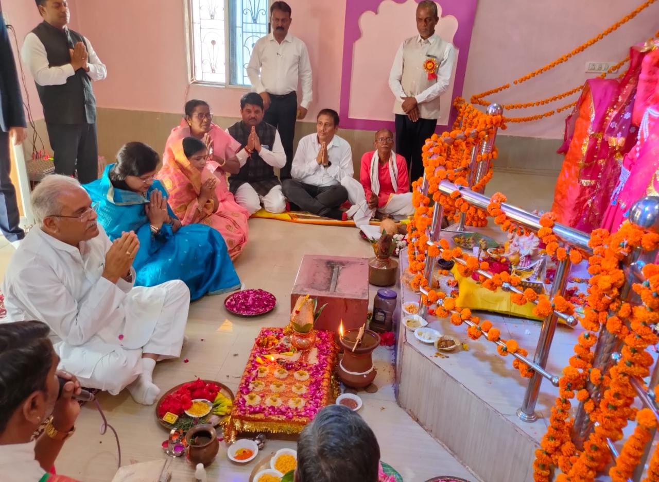 Balod 19 February 2023. Chief Minister Mr. Bhupesh Baghel attended Sarhargarh Mahotsav organized at village Sorar in Gurur tehsil of Balod district today. He reached the temple of Mata Bahadur Kalarin located in Sorar and offered prayers to Mata Bahadur Kalarin with complete rituals and wished for the happiness, prosperity and prosperity of the people of the state. During this, the Chief Minister also presented clothes to the priests of the temple.