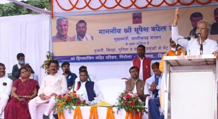 Raipur, 18 October 2021: Chief Minister Bhupesh Baghel, who reached Jagdalpur to attend the world famous Bastar Dussehra for the development of Bastar, today on the second day of his stay at Girola in Bakwand development block, discussed with priests, Sirhas, Gunias and heads of society. . On his arrival at Girola, the priests, Sirhas, Gunias and heads of society gave him a warm welcome.