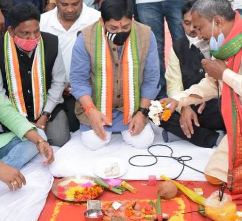 Raipur, 09 January 2022. Urban Administration, Development and Labor Minister Dr. Shivkumar Dahria performed bhoomi pujan of various road construction works costing about Rs 40 crore under Arang block of Raipur district today. Road widening, road strengthening, C.C. Roads, asphaltization and other works are included.
